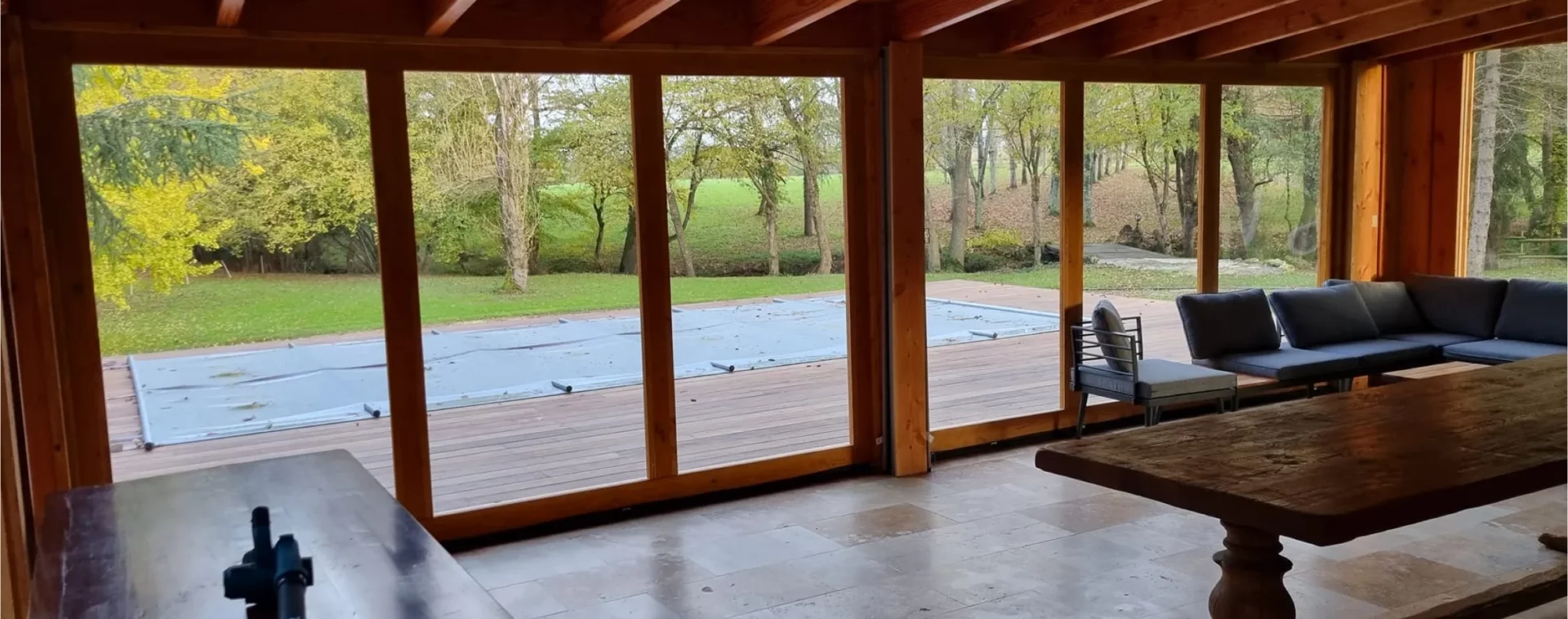 Réalisation de petites charpentes en bois pour pool houses. Structures légères qui abritent, protègent et organisent les extérieurs.